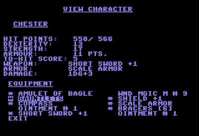 A couple of bars of Bach's Toccata and Fugue in D Minor play over the title screen, and then we get a little of Grieg's "In the Hall of the Mountain King" as the game loads. Character creation consists of random rolls for to-hit score, maximum hit points, dexterity, strength, and armor, then a name. Soon, the character is at 0,0 on Level 1. Except for a few places in which you have to enter text, the joystick controls all the action. Even visiting inventory requires pushing down and the button at the same time.
